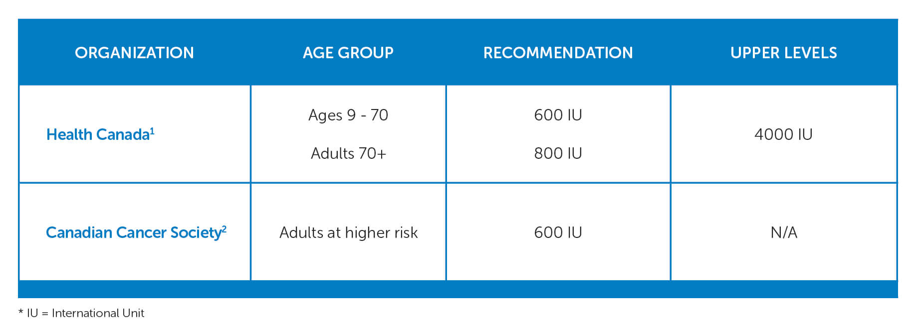 Every person’s needs are different, and we cannot recommend dosing to your specific needs. We can, however, provide you with the recommended vitamin D dosing from many groups here in Canada.