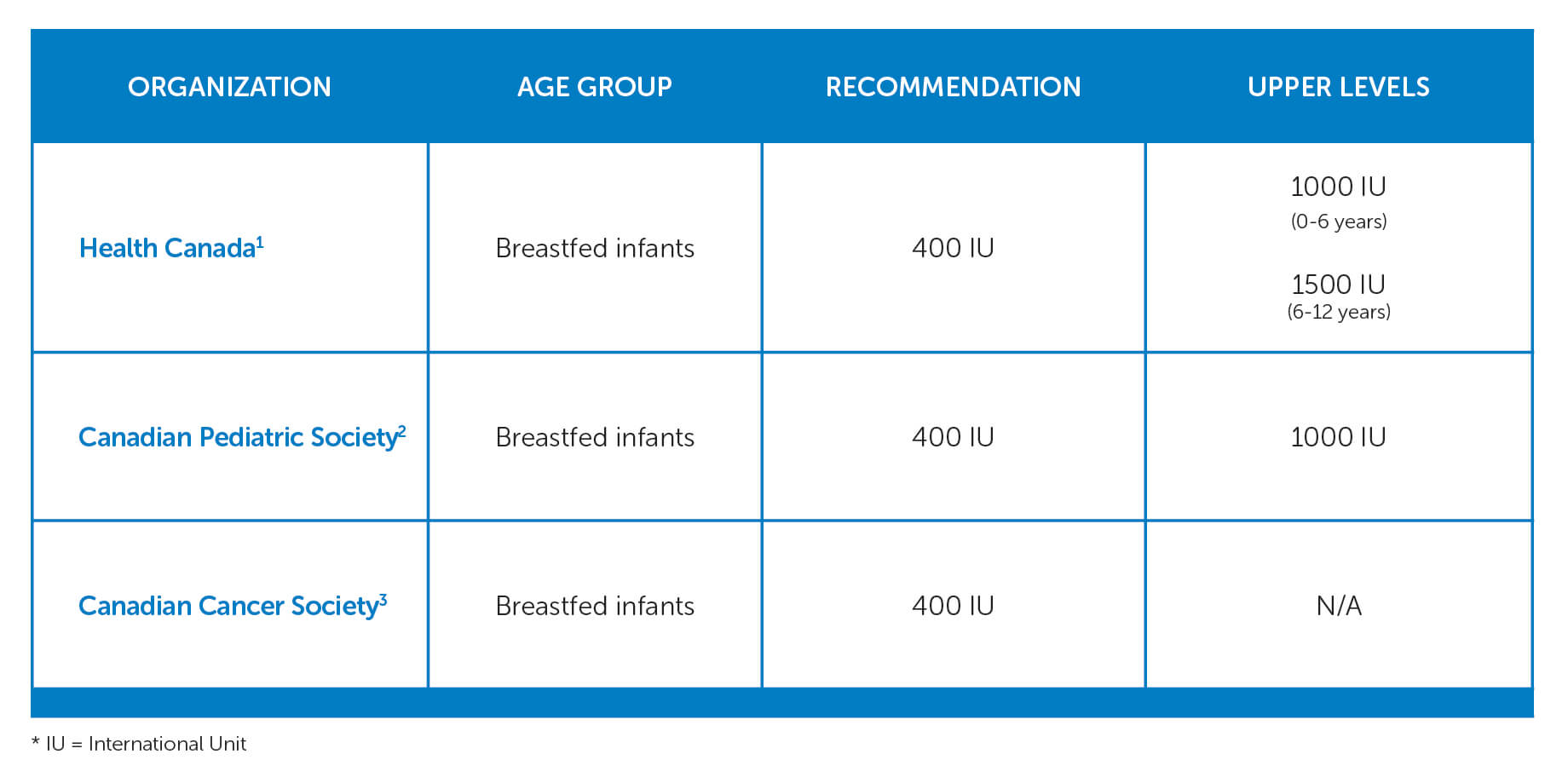Every child is different, and we cannot recommend dosing specific to your child’s needs. We can, however, provide you with the recommended vitamin D dosing for infants from many groups here in Canada.