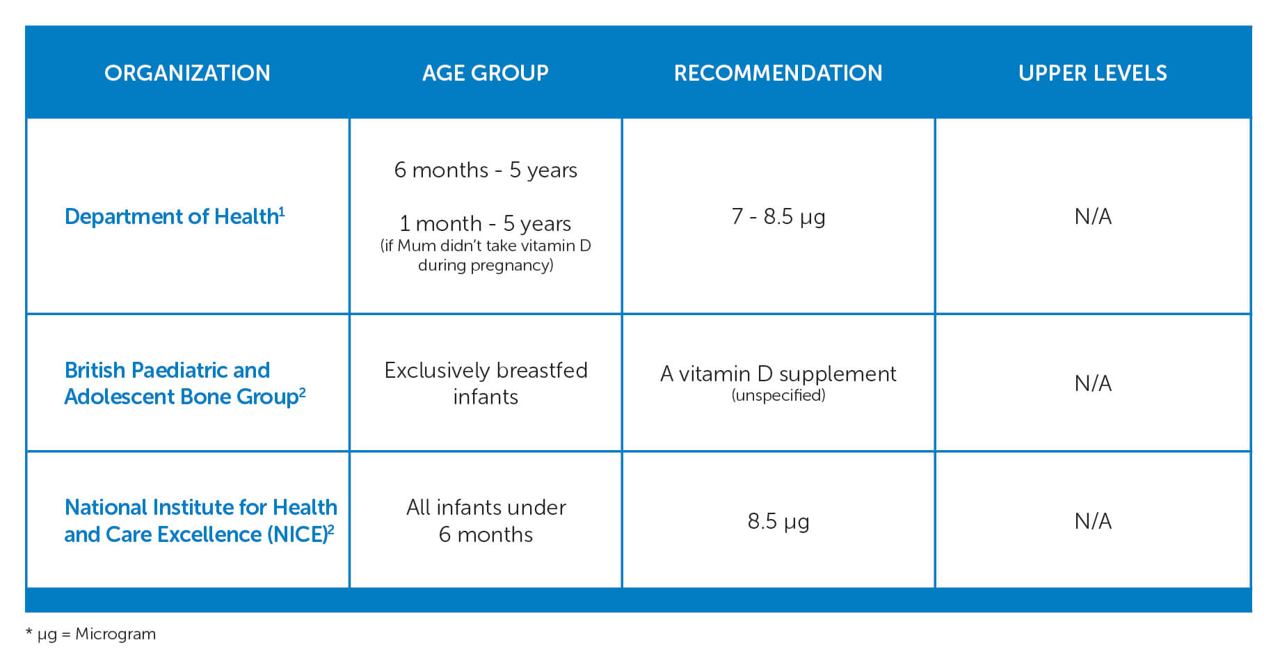 Every child is different, and we cannot recommend dosing specific to your child’s needs. We can, however, provide you with the recommended vitamin D dosing for infants from many groups here in the United Kingdom.