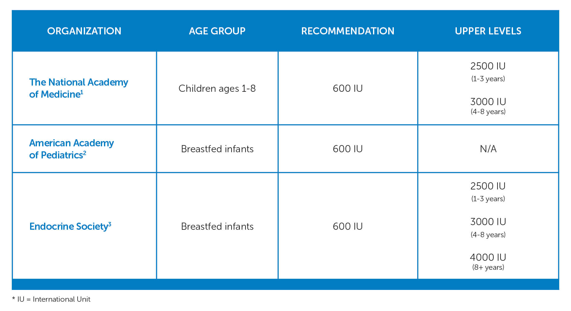 Every child is different, and we cannot recommend dosing specific to your child’s needs. We can, however, provide you with the recommended vitamin D dosing for infants from many groups in the United States.