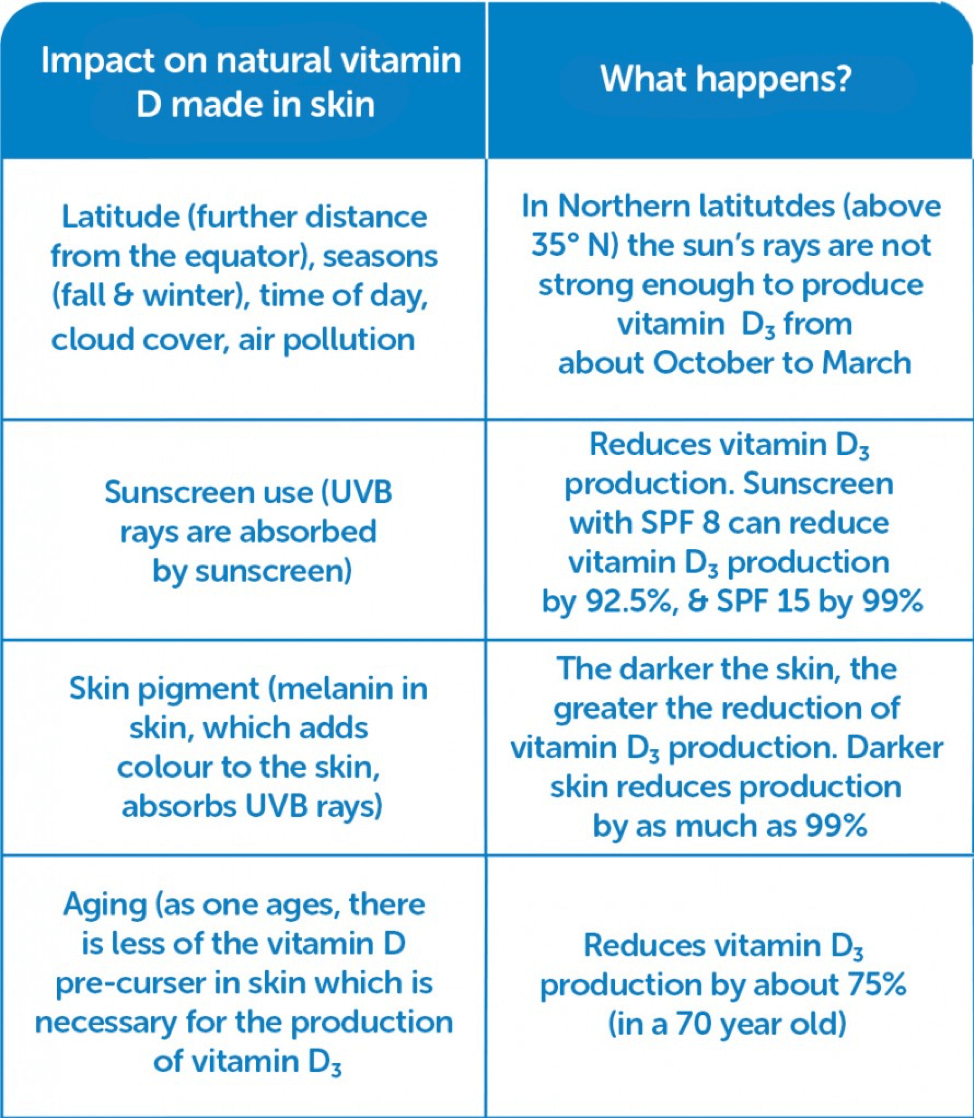 - Sunscreen use (SPF 15 sunscreen reduces vitamin D production in the skin by 99%)