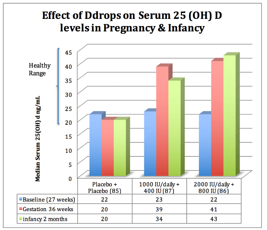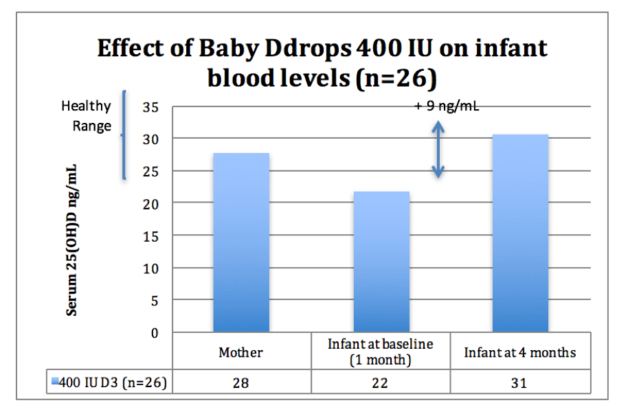- Healthy breastfed infants taking a daily 400 IU dose of Baby Ddrops® for 3 months experience a mean increase of 9 ng/mL or 22 nmol/L in serum 25-OH vitamin D levels[1]