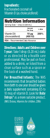It is important to always refer to the Nutritional Information and Directions provided by the product (typically located on the side of the packaging) and to speak to your health care professional before taking any new medications. For those living in the UK, Ddrops® One is available for the whole family, specifically designed to deliver the daily recommended dose of 10 µg ever drop.