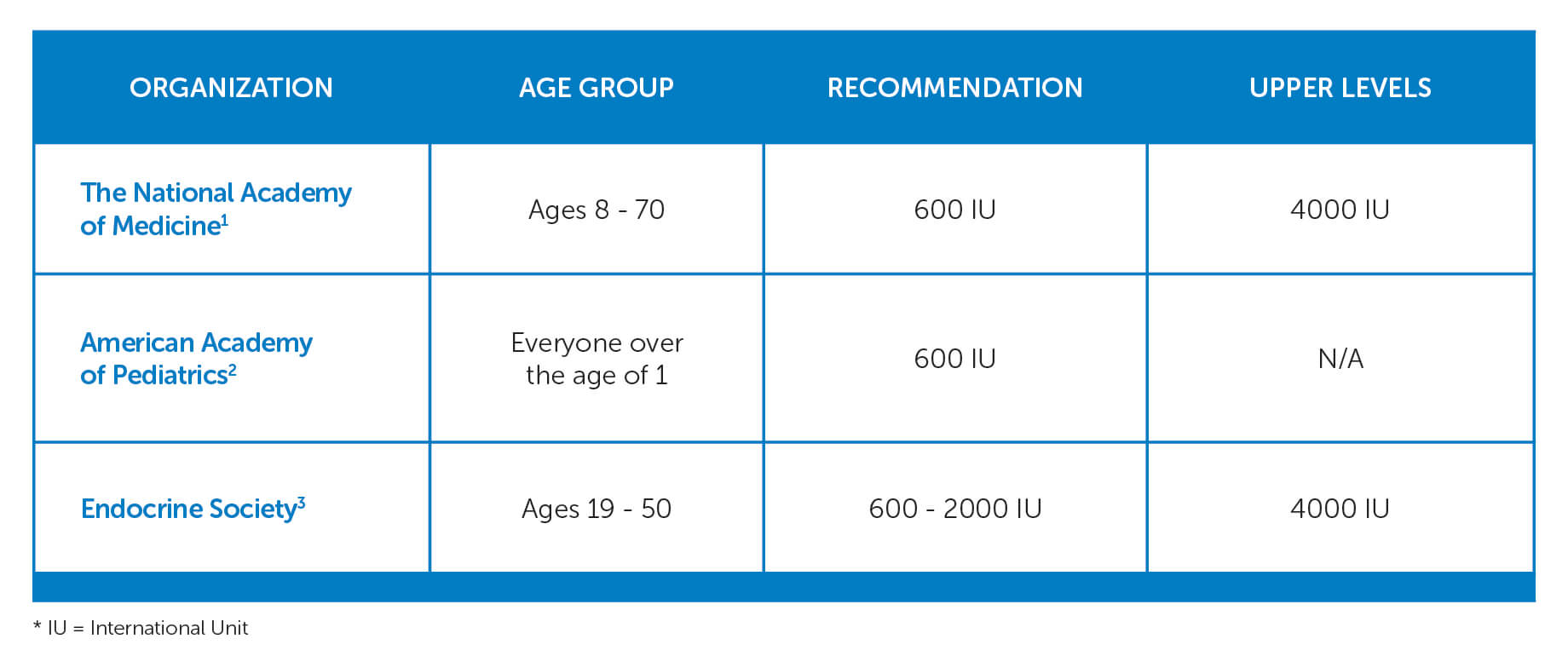 Every person’s needs are different, and we cannot recommend dosing to your specific needs. We can, however, provide you with the recommended vitamin D dosing from many groups here in the United States.